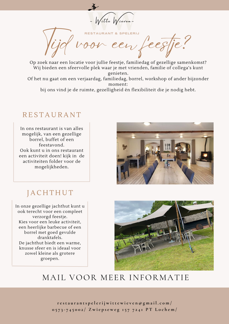 Voor de mogelijkheden neem contact met ons op via 0573-745002 of mail naar restaurantspelerijwittewieven@gmail.com